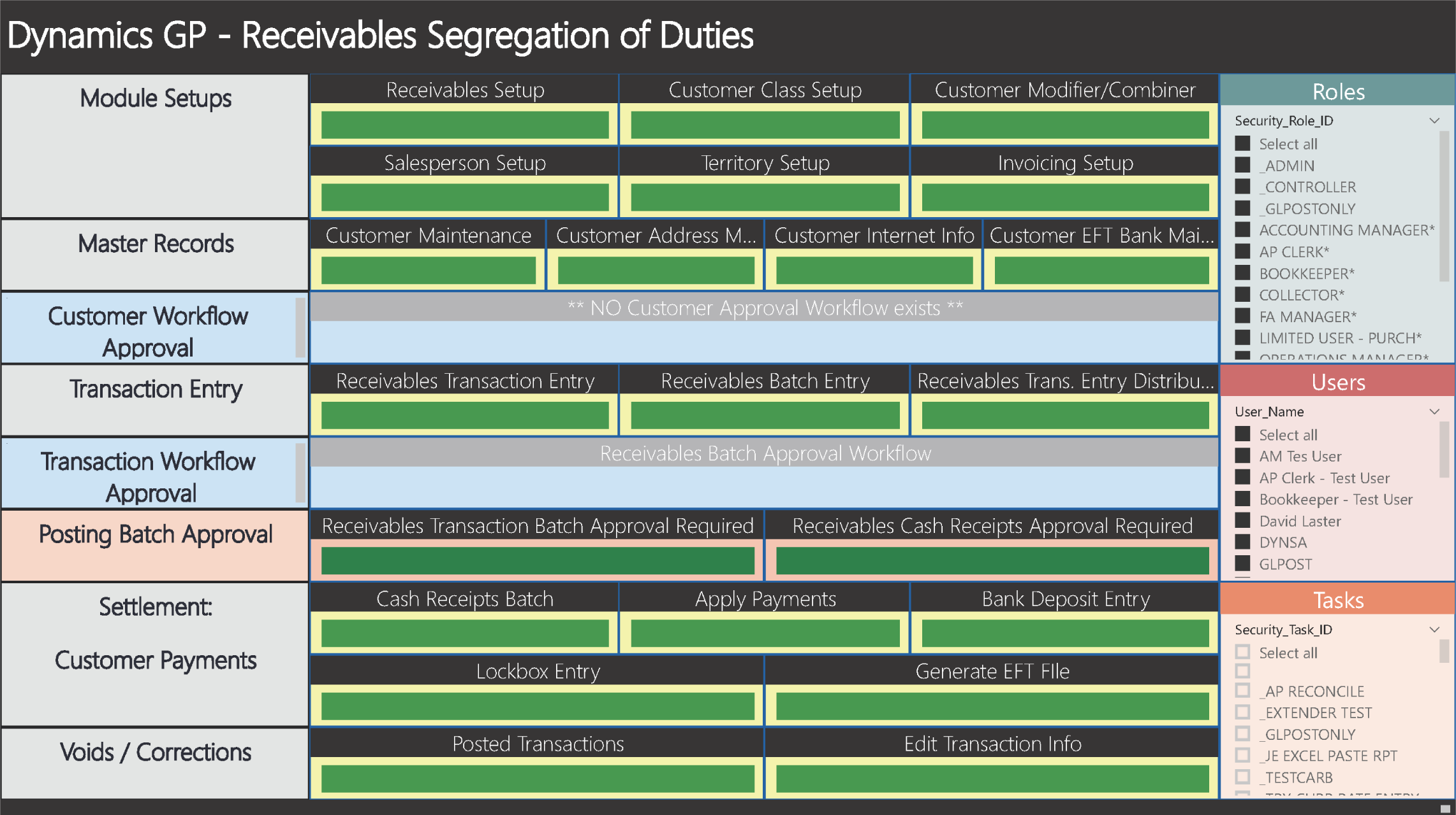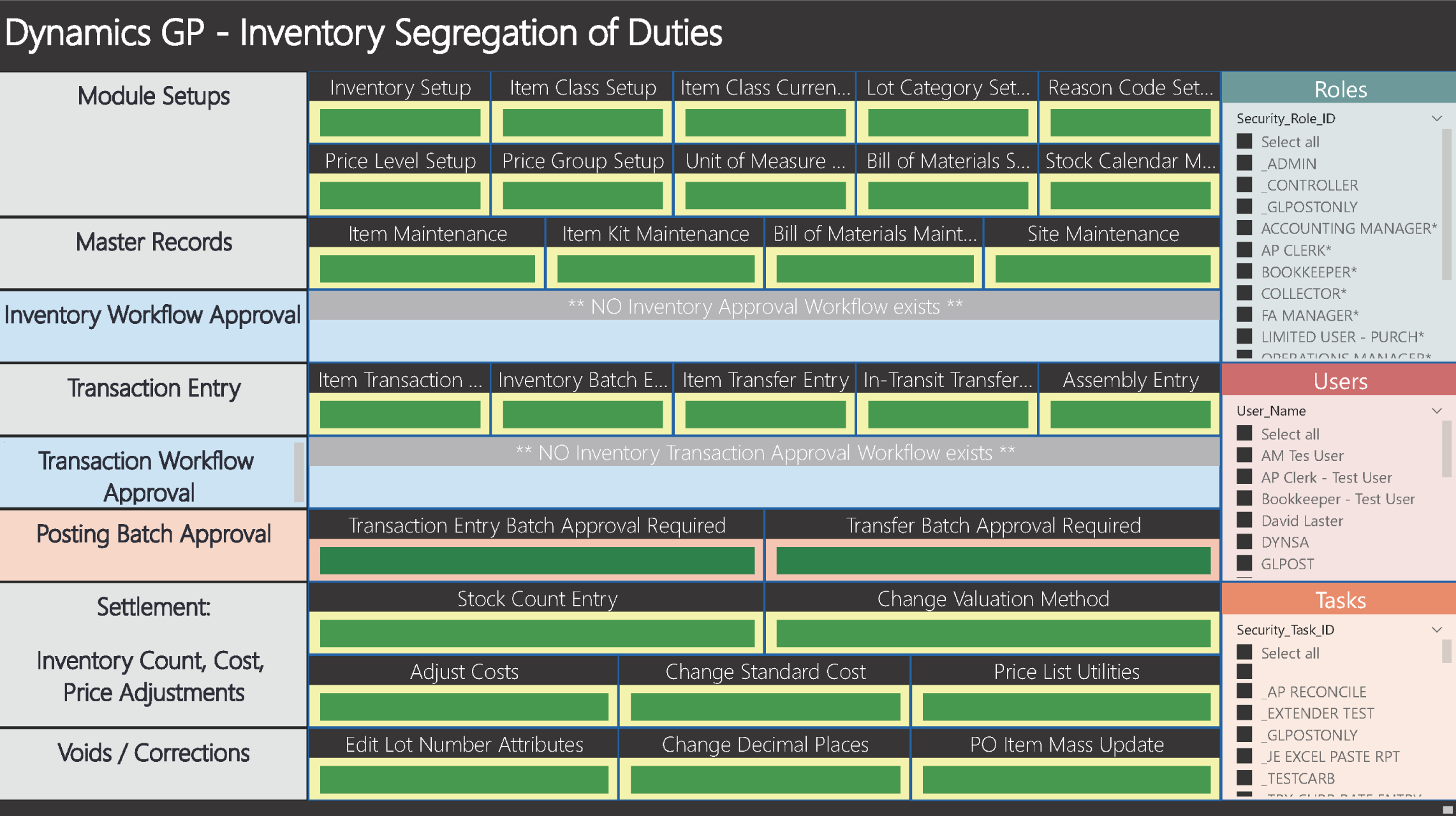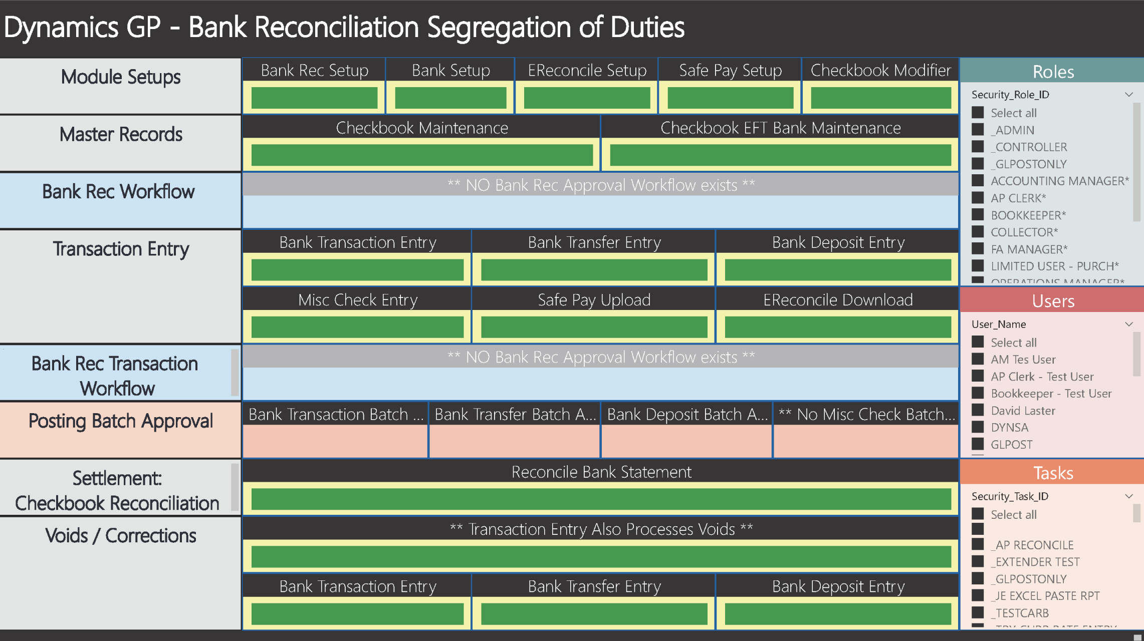 There are six Power BI dashboards in the GP Security Analyzer that visually and interactively illustrate Financial, Payables, Purchasing, Inventory, Receivables, Sales and Bank Reconciliation controls by User and Role. The dashboards segregate access based on Setup, Maintenance, Transaction Entry, Settlement and Void permissions, interwoven with both GP Workflow Approvals and Company Posting Batch Approval controls where enabled within their respective setups.