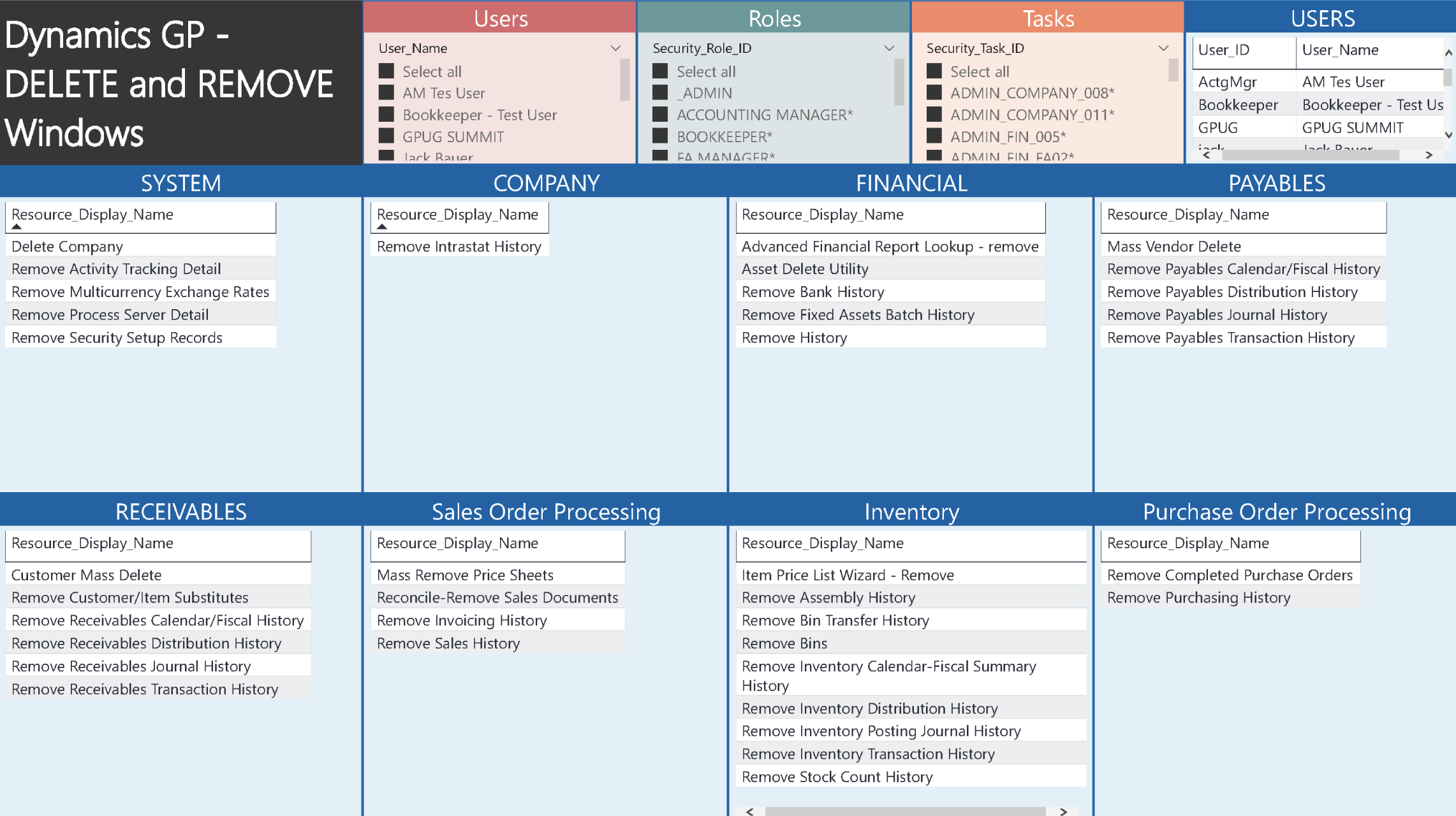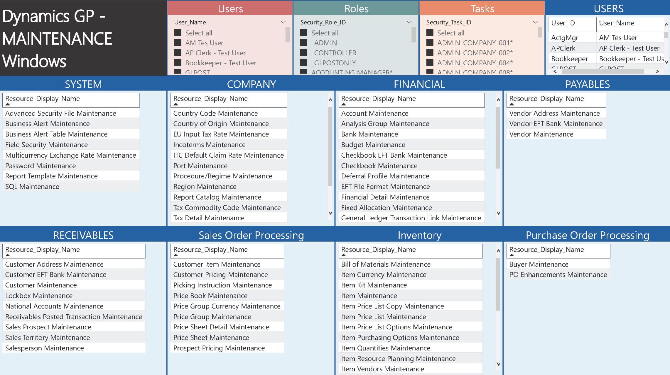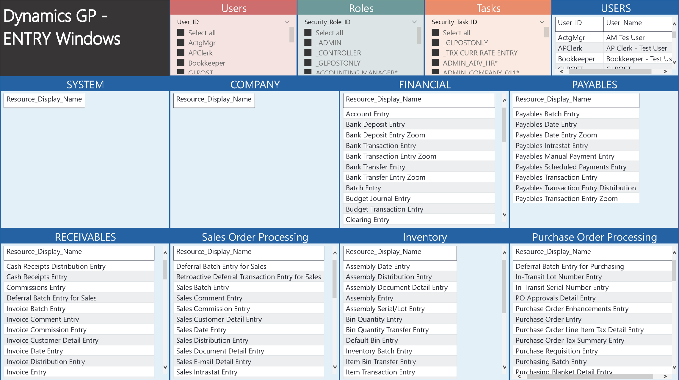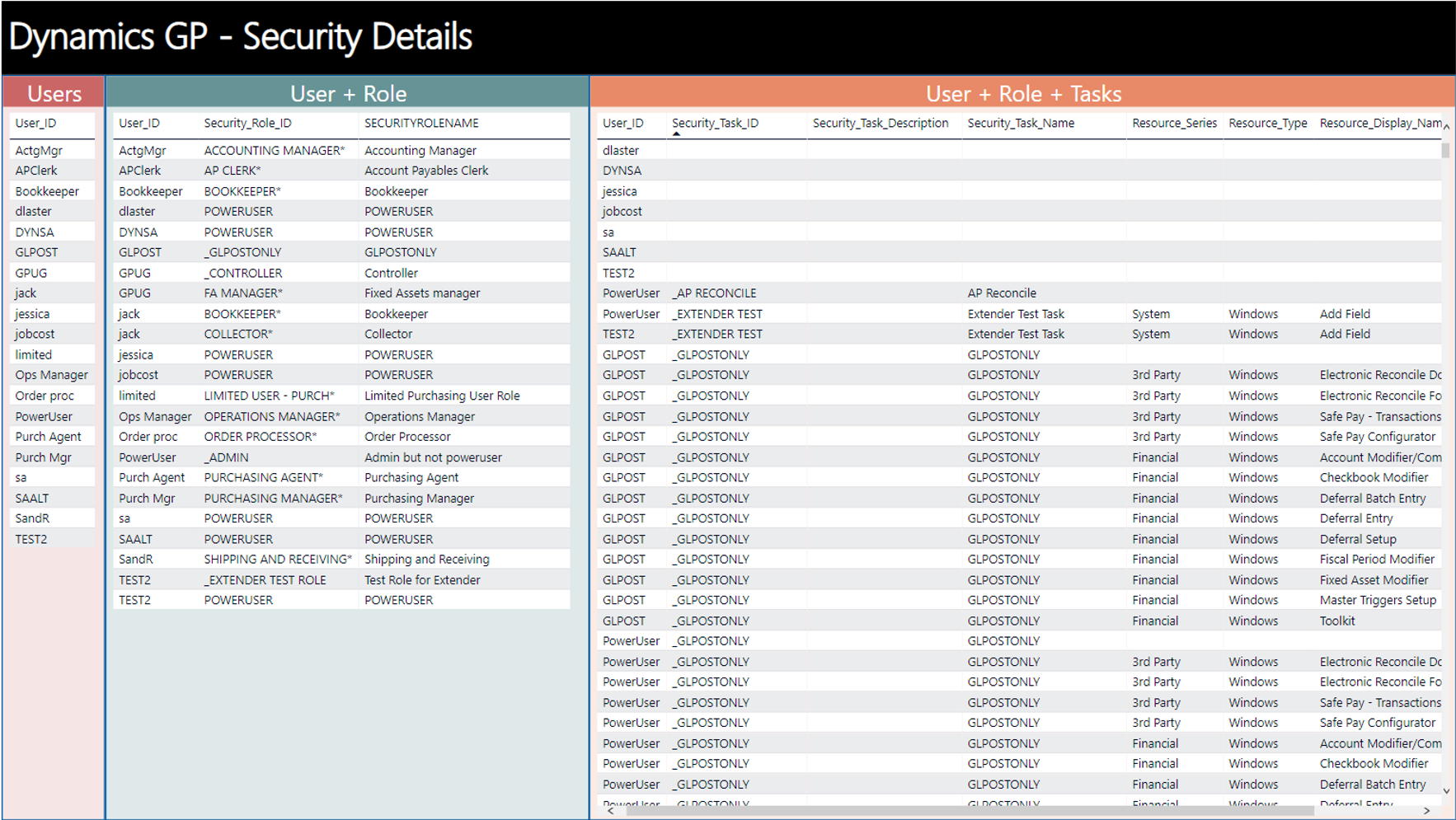 (Really) Analyzing GP Security is not a small task. The traditional approach has been to create custom SQL Views attached to Smartlists that read, filter and export the data, or by using custom refreshable Excel reports with embedded links and pivot tables, or by using the embedded GP Reports and various setup and inquiry windows. All of these produce a massive amount of data but very little meaning because these reports can often be over 1,000 pages long, and the SQL view can easily be over 500,000 lines deep.