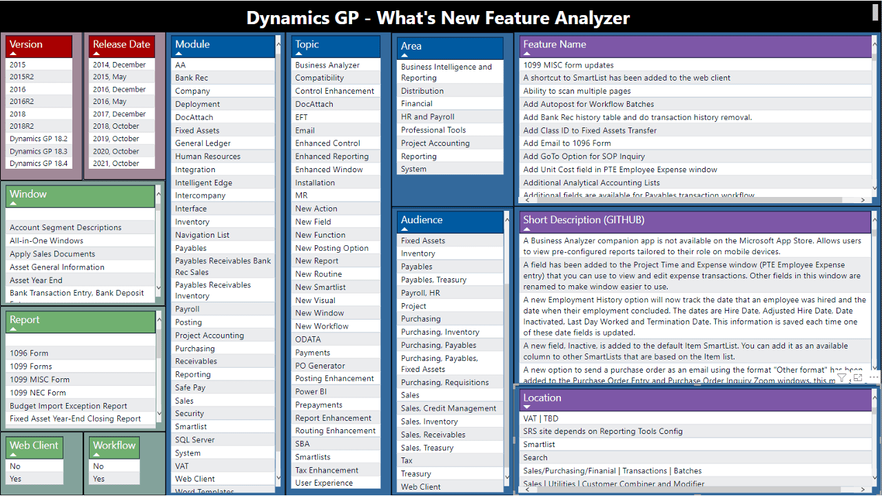 As we continue to expand our Power BI Solutions, we’re excited to introduce our newest creation – the Dynamics GP What’s New Feature Analyzer dashboard!