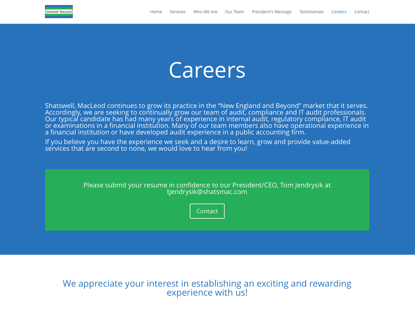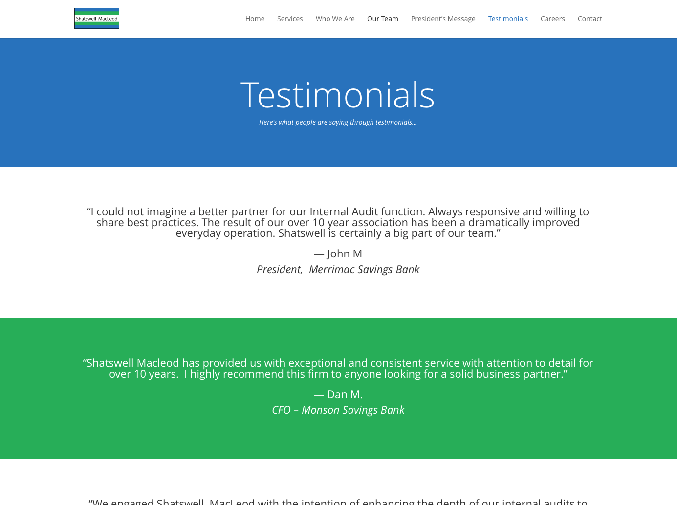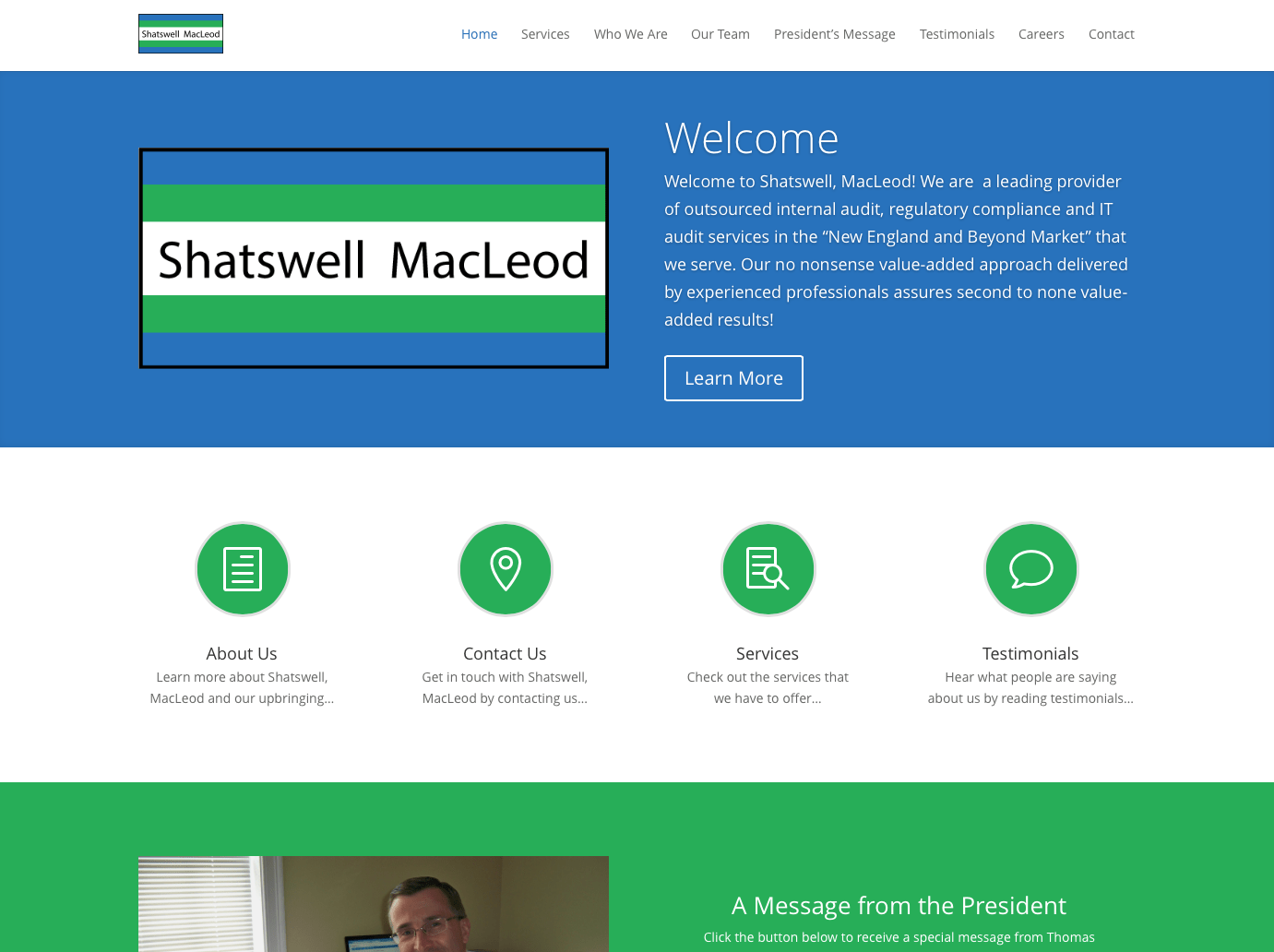 GraVoc completely redesigned Shatswell, MacLeod new website. Shatswell, MacLeod is a leading provider of outsourced internal audit, regulatory compliance and IT audit services in the New England and beyond market. Shatswell, MacLeod wanted to adopt the new direction of the company to reflect their website. The color scheme is modeled after their tri-color logo of white, green and blue. By splashing these colors throughout their website, Shatswell, MacLeod is ensuring that their company is well branded and will be easily recognized when incorporating this color scheme.